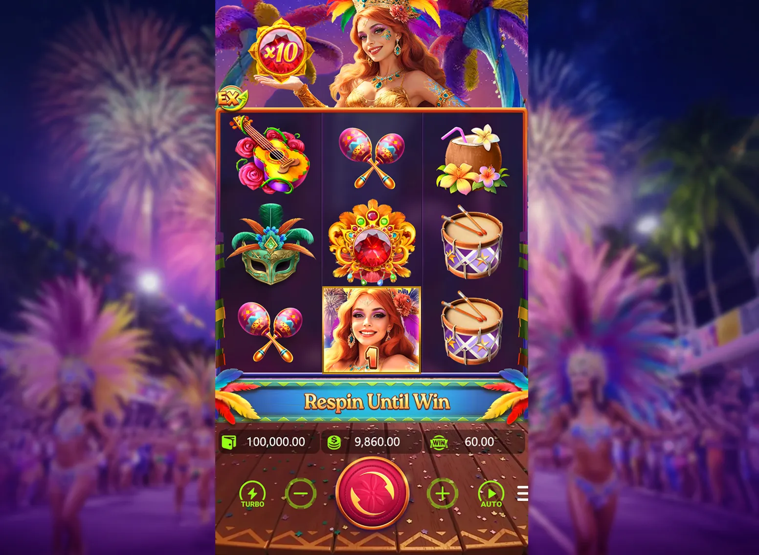 Join the street party frenzy! Dynamic reels accelerate with samba tempo, while falling streamers lock winning symbols. Activate "Carnival Float" bonus to collect flowers and candies tossed from parade floats - each gift contains instant cash prizes respin opportunities!